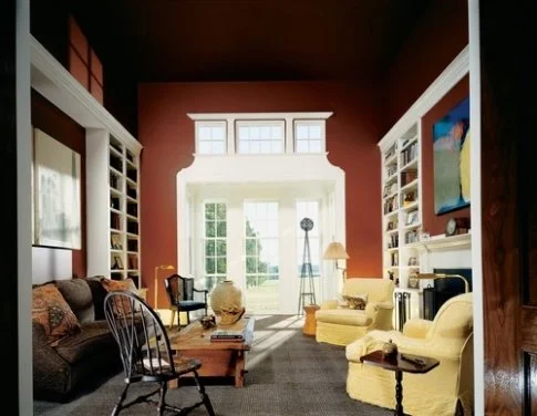 The Marsala paint colour used on the walls of this book-lined living room adds a touch of warmth. The contrasting white woodwork creates a clean look and keeps Marsala from looking too earthy.
