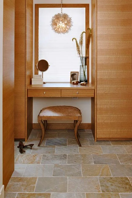 An offset tile layout with a tile that looks like wood creates a faux-wood floor with the durability of tile.