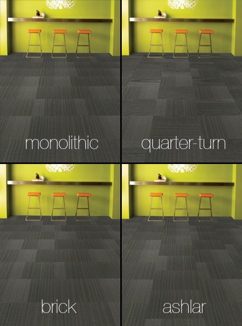 Using different installation methods can create an entirely different looking carpet for some patterned carpets. Each of the different installation methods below creates a different look for one style of carpet tile.