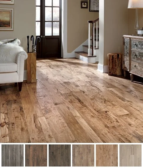 Hickory, maple, white oak and American walnut – this random width hardwood has options from a wide variety of hardwood species. The planks are full of character, embracing all the natural imperfections of each wood species. Heavy bevelling and handscraping add to the overall worn, rustic look.
